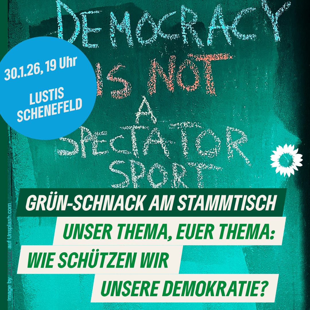 Gute Kommunikation und Information wären dann auch der Schlüssel zur Verteidigung der Demokratie auf lokaler Ebene, also zum Beispiel bei uns in Schenefeld. Wie kann das gelingen? Über diese Frage wollen wir beim Grün-Schnack am 30. Januar mit Wigbert Löer diskutieren. Wigbert Löer hat die Koordinations- und Fachstelle (KUF) der Partnerschaft für Demokratie Schenefeld inne und ist damit hauptamtlicher Verantwortlicher für das Bündnis für Demokratie Schenefeld.